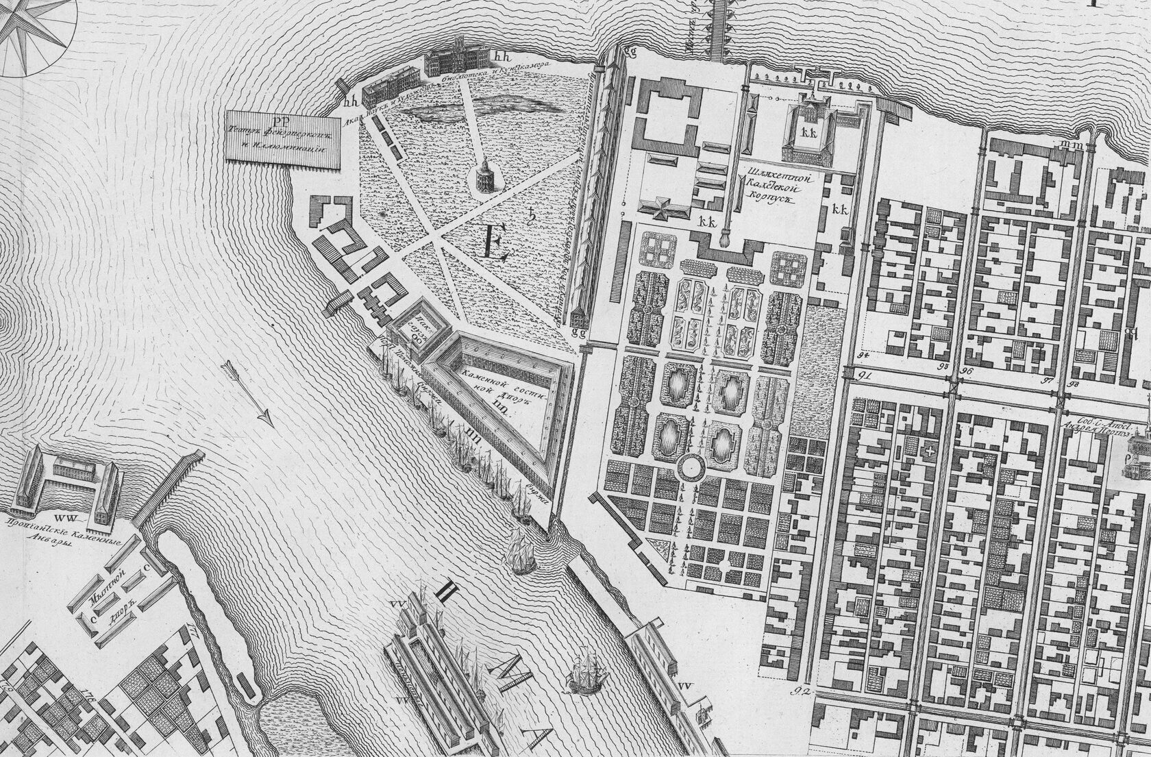 На фрагменте карты видна стрелка Стрелка Васильевского острова. Вокруг площади: здание Академии наук (бывший дворец Прасковьи Фёдоровны), Кунсткамера, здание Двенадцати коллегий, Биржа (бывший Каменный Гостиный двор), Таможня.