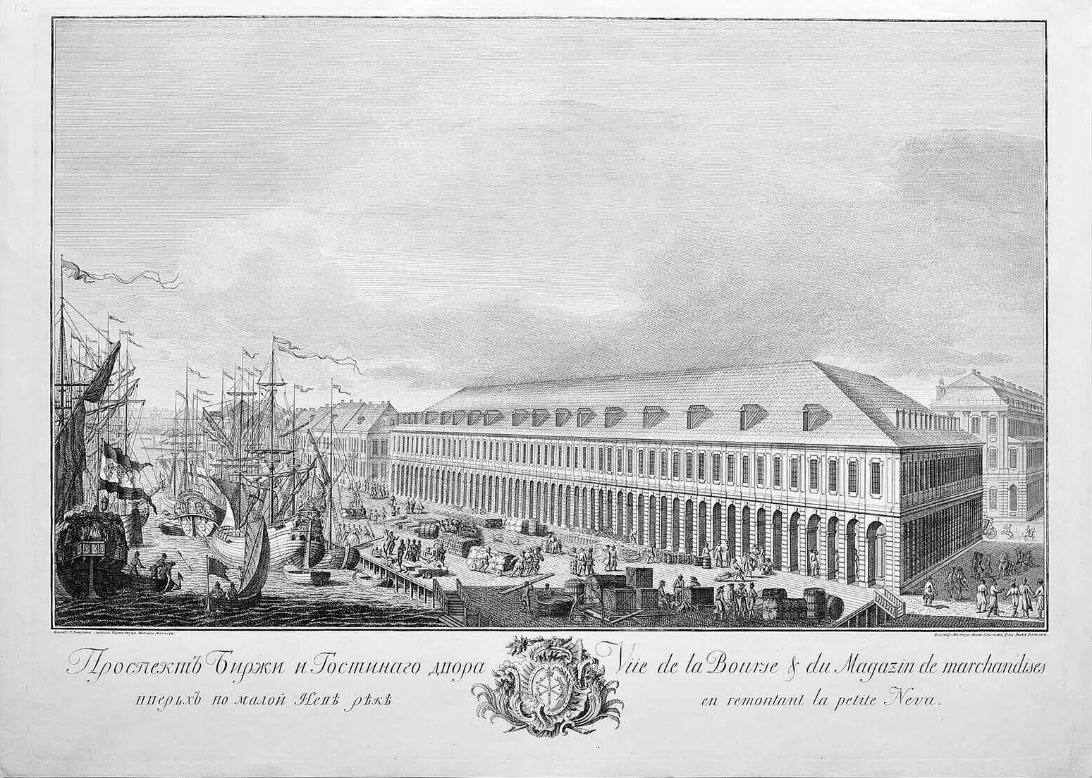 Здание Гостиного двора служило складом экспортных товаров. На гравюре запечатлены жанровые сценки: иностранные купцы, грузчики, перевозящие ящики и бочки с кораблей в Гостиный двор, дам-модниц, наблюдающих за погрузкой-выгрузкой товаров.