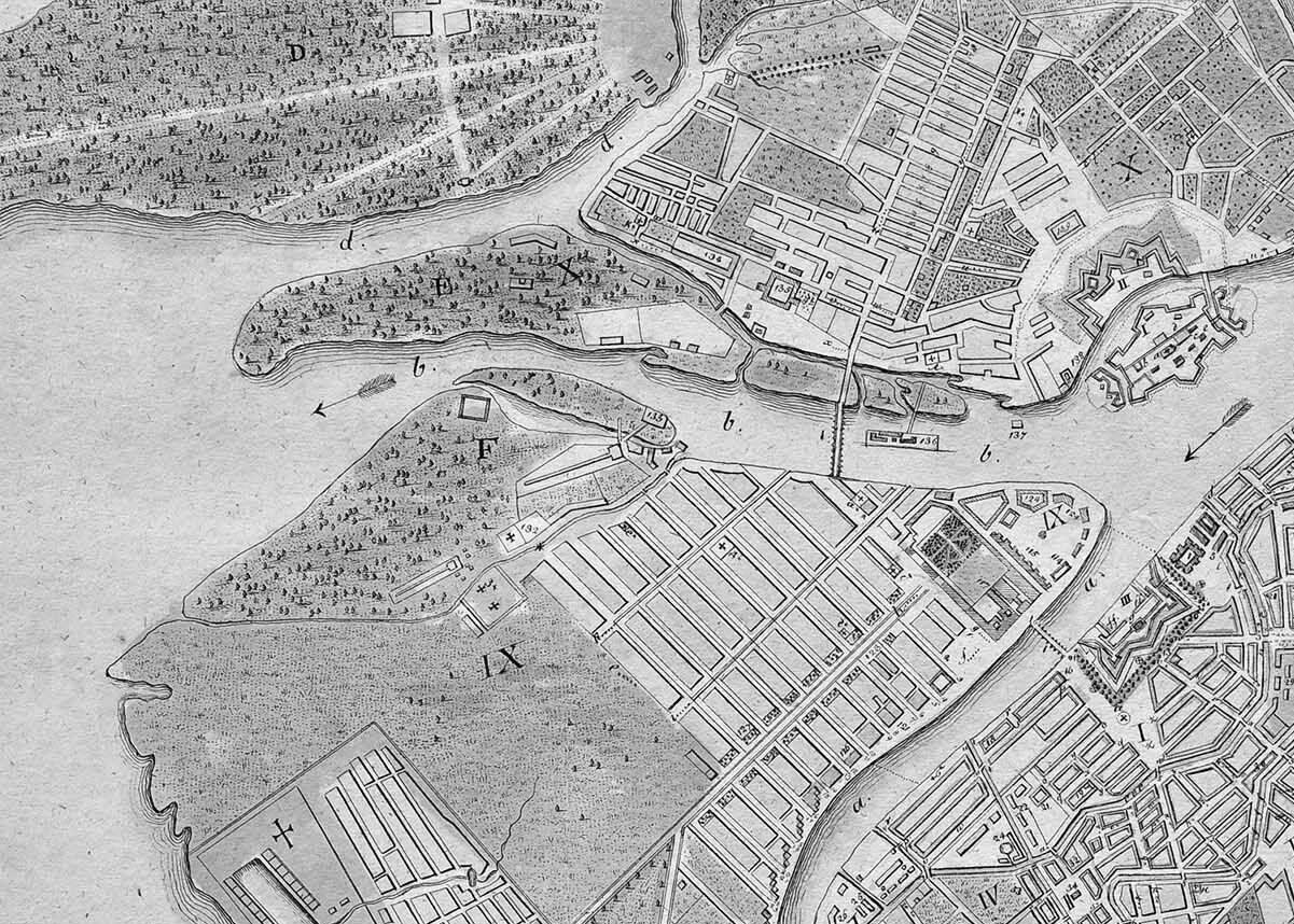 В середине — не построенный собор. Моста, соединяющего остров с Петроградской стороной, еще нет. На карте видна сеть судоходных каналов — архитектор Доменико Трезини разработал проект.