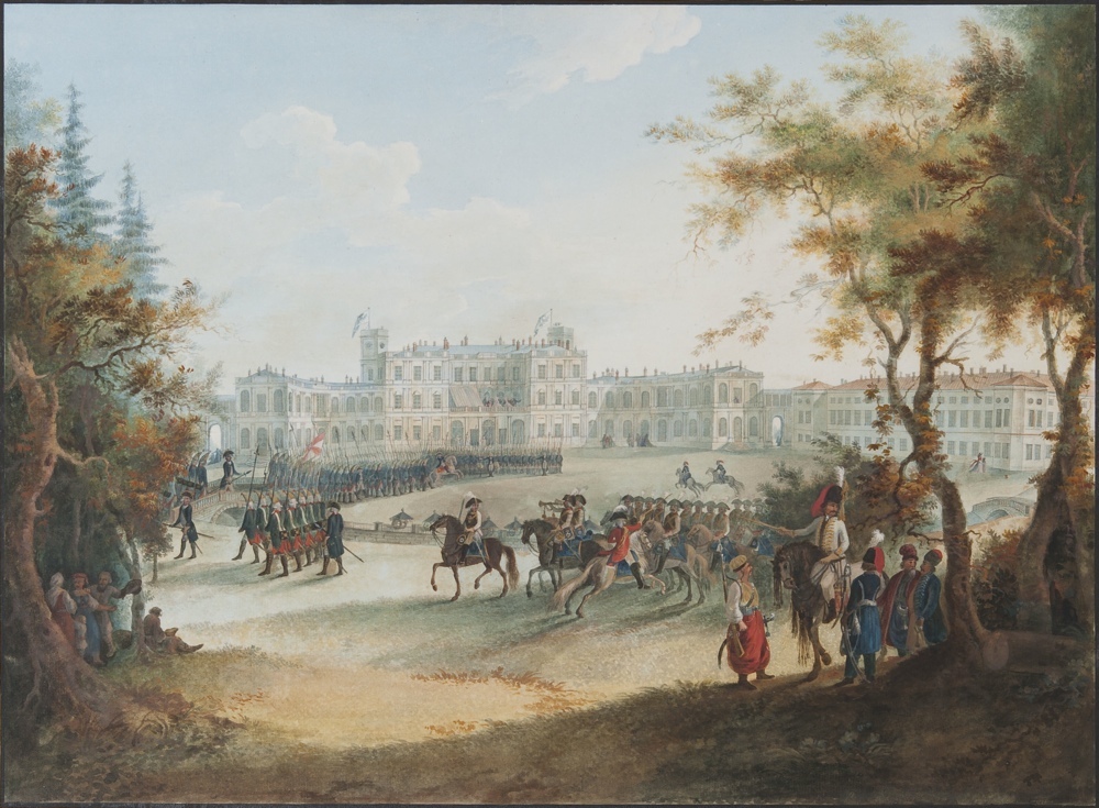Павел I увлекался военным делом и в тоже время был почитателем романтизма и рыцарства, поэтому перед дворцом он построил плац, где регулярно проводил парады и смотры армии. Боковые галереи были надстроены и стали закрытыми.